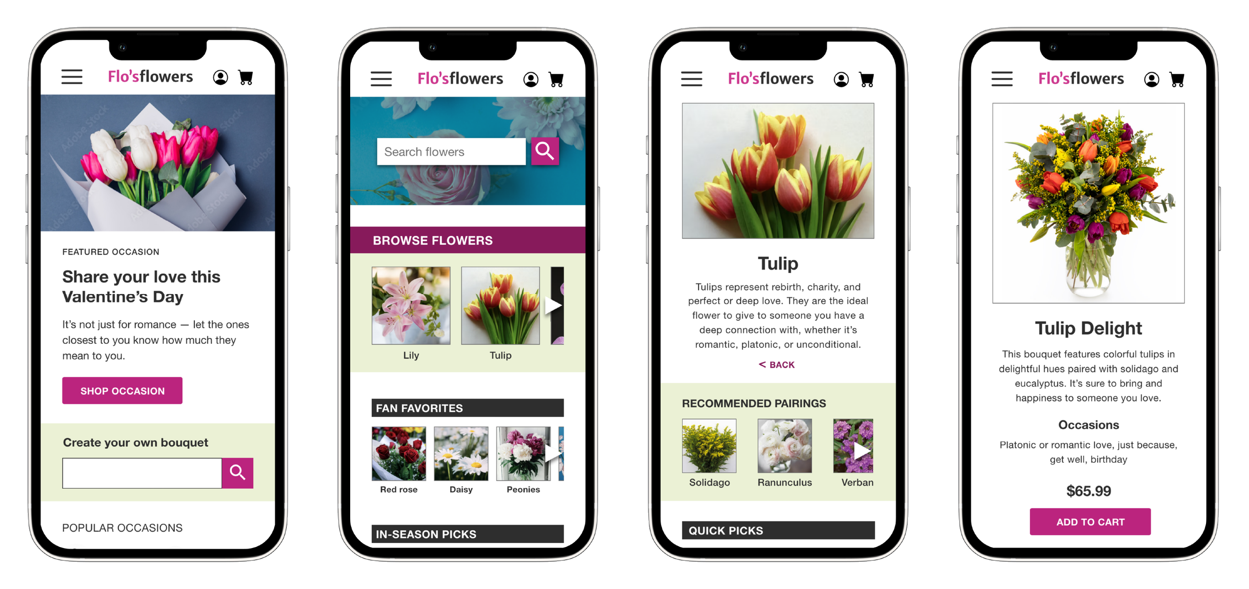To create a low-fidelity prototype, I connected all of the screens involved in the primary user flow of searching for a flower, selecting and adding a bouquet to the cart.